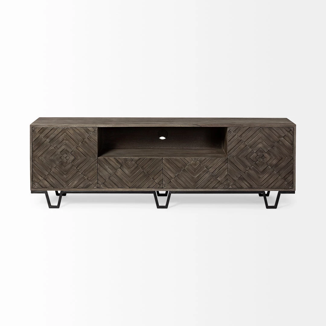 The Argyle II media console, expertly crafted from brown wood and mounted on a sturdy black metal frame, makes for a substantial addition to your space which is built to stand the test of time.