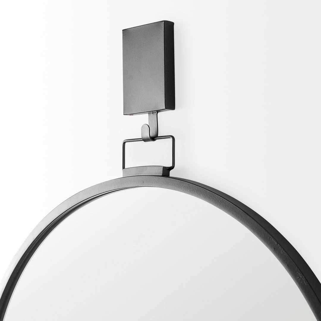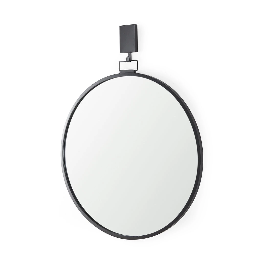 This round mirror, encircled by a slender iron frame, hangs sleekly from a square, iron hook.