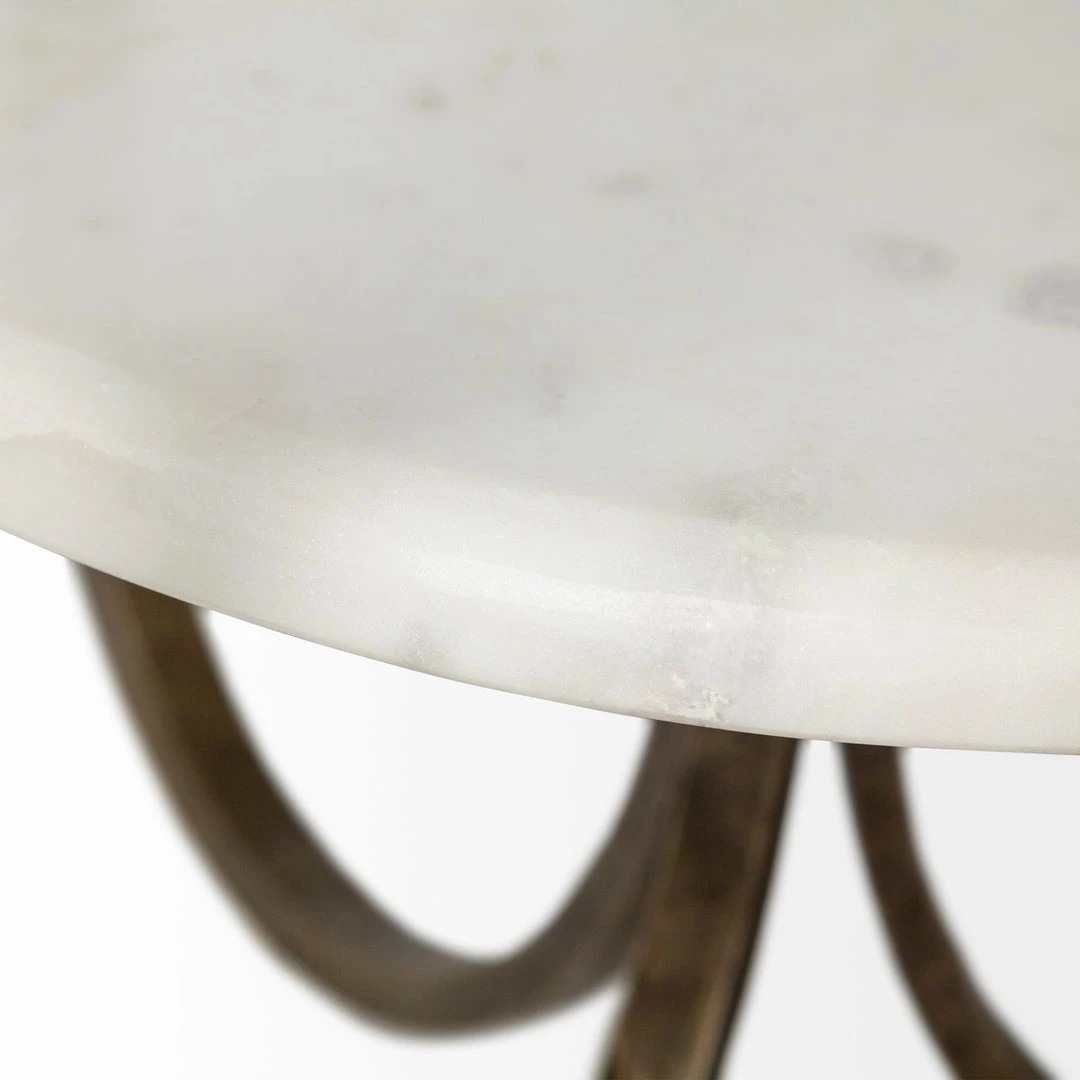 The white marble shelf has creamy undertones with gray and beige veining throughout, while the iron base features a beautiful, antique gold finish. *Marble is a natural material. Each piece has its own beautiful intricacies, and some may carry naturally occurring fissures. Please expect variations in color and texture.Â