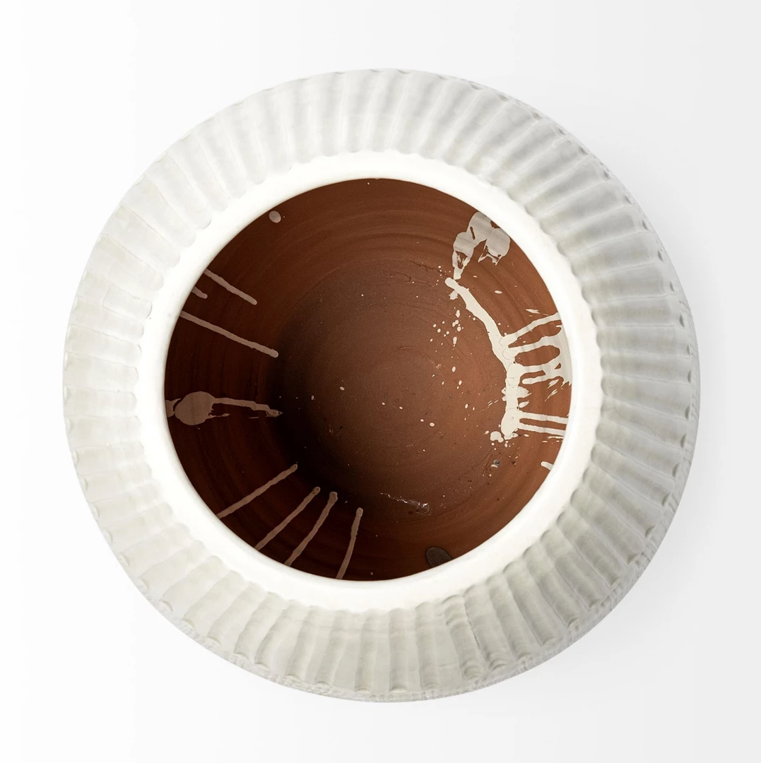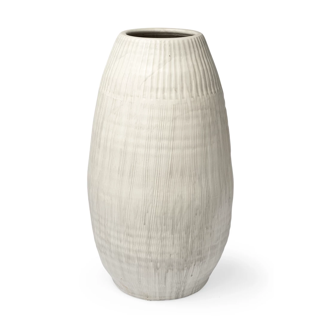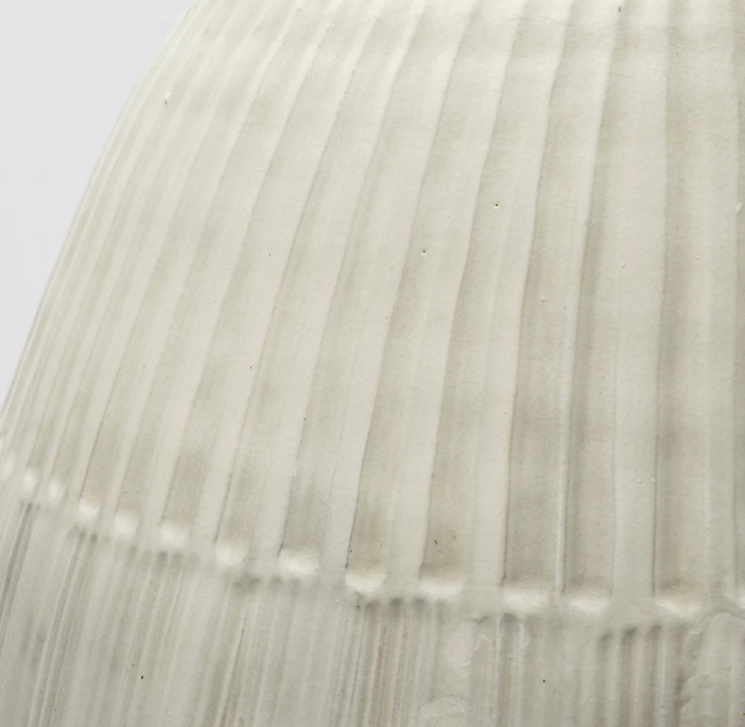 Expertly crafted from ceramic and finished in a Pearl white glaze, the Reya is a spectacular vase featuring an elliptical silhouette and a raised striped pattern on the exterior.
