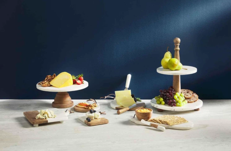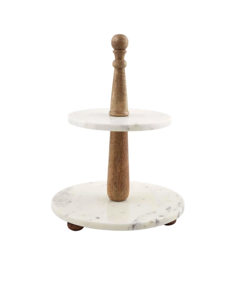 Two-tier white marble server with center mango wood dowel. Knocks down for storage.