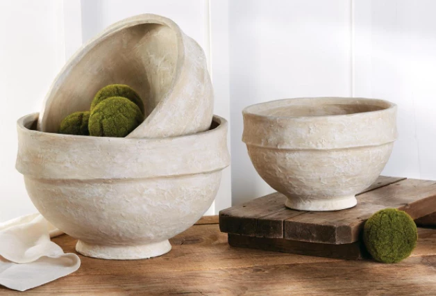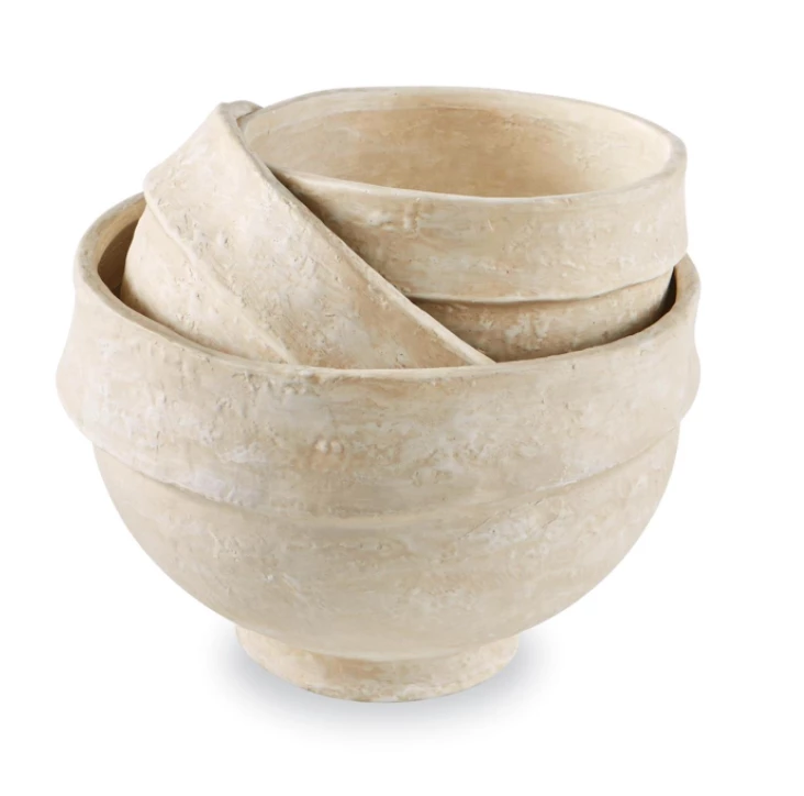 Nested set of three paper mache bowls feature pedestal bases and rustic textured detail.