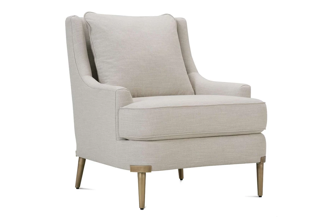 Eclectic, Spirited and wonderfully comfortable. The Lyra Upholstered Chair is fully upholstered with a loose pillow back and metal legs.