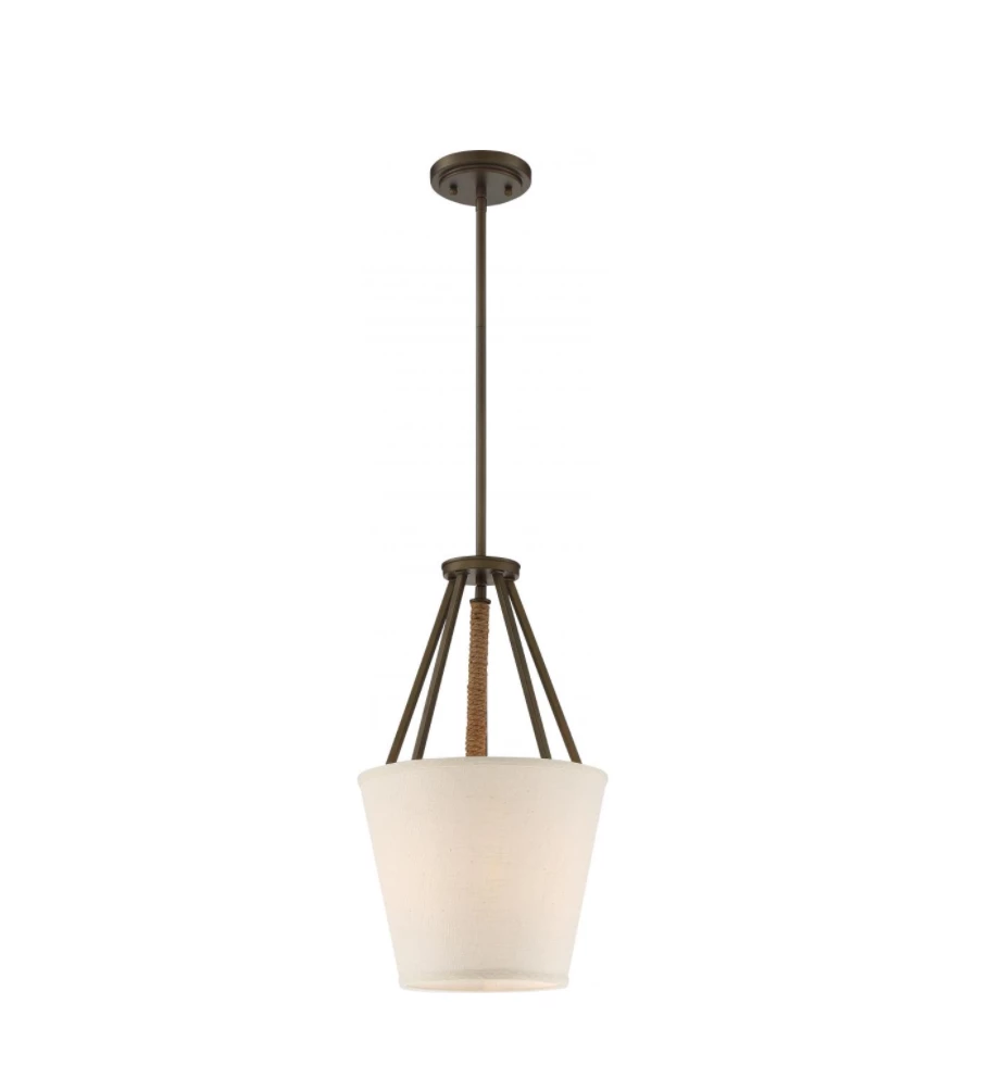 3 Light 12” Pendant with Beige Linen Fabric Shade – Aged Bronze Finish with Rope Accent