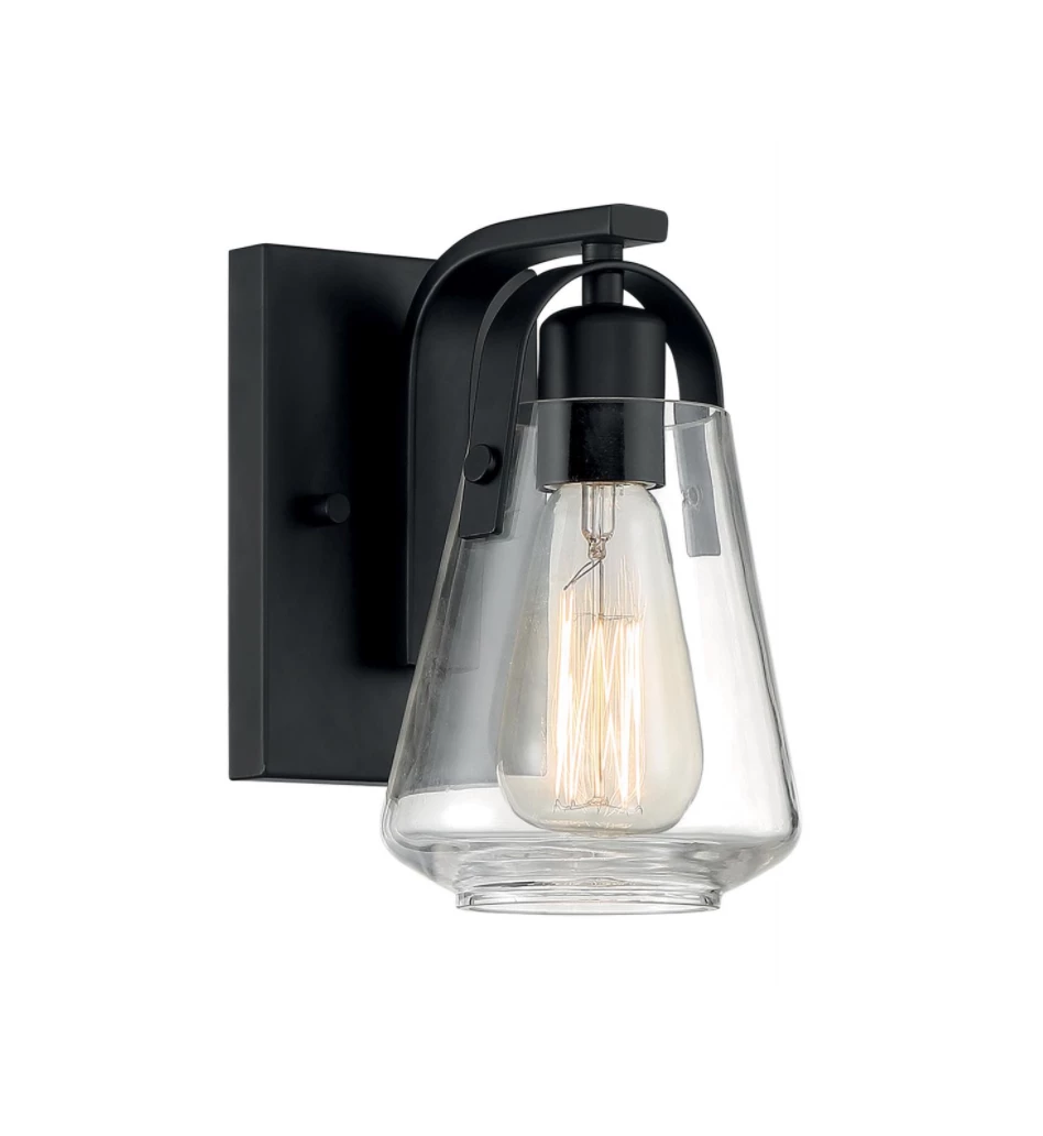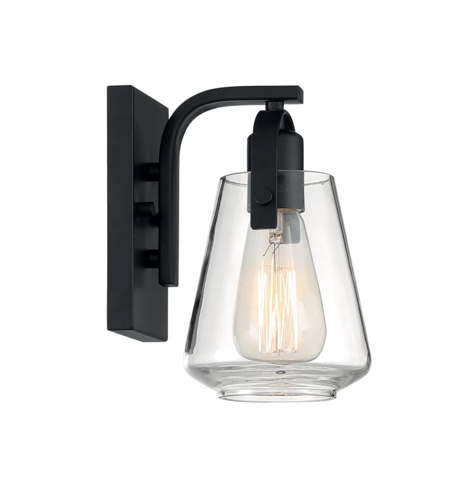 Industrial style one-light wall sconce available in matte black and brushed nickel