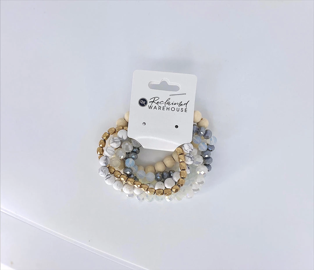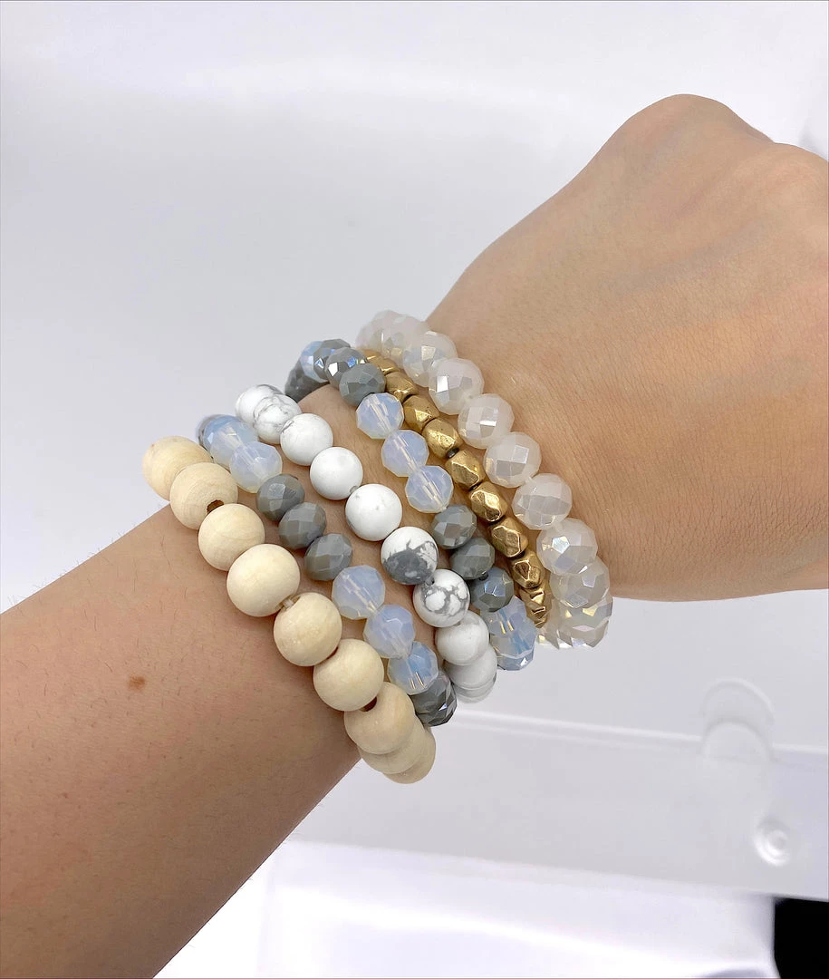 Includes 5 Bracelets,;1 Ivory Faceted Bead Bracelet, 1 Natural Wood Bead Bracelet, 1 Grey & Clear Faceted Bead Bracelet, 1 Gold Bead Bracelet, & 1 White Marble Bead Bracelet