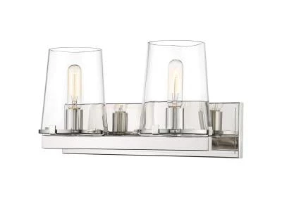 Showcasing a rich, polished nickle finish, this metal vanity light makes a stylish impression in a modern powder room. Three tapered, clear glass shades complete the design in effortlessly elegant style