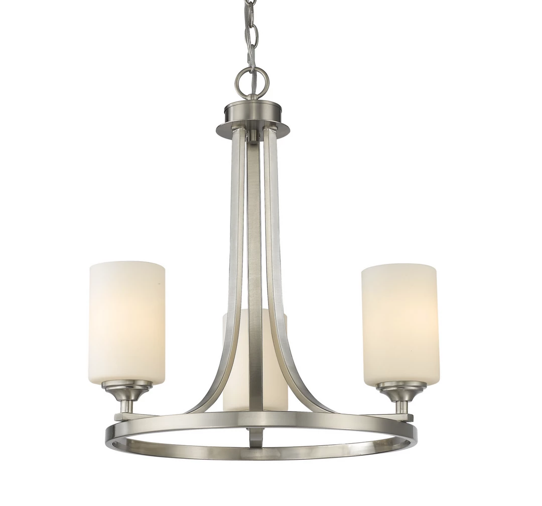 The circular base and the waterfall arms of the Deanna family is modernized by the soft matte opal shades which is paired with brushed nickel fittings.