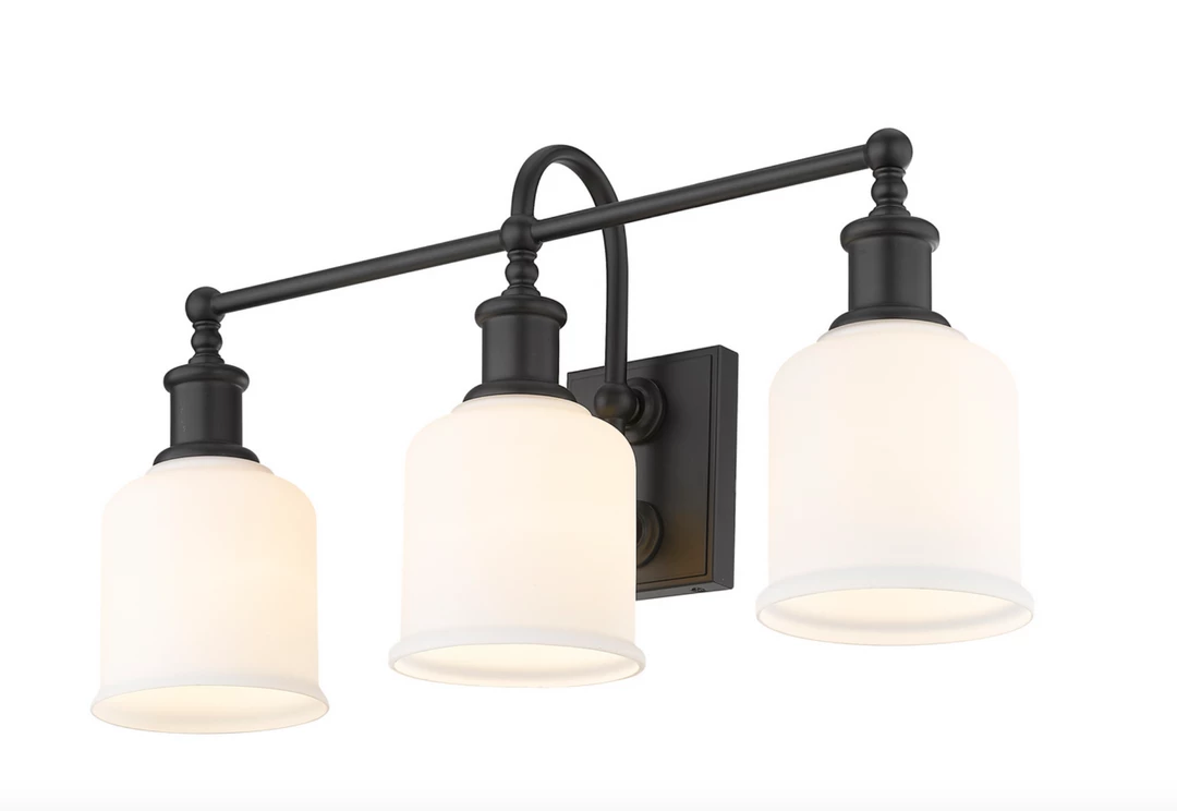 This three-light bath light from the Elsie collection introduces a charming nautical vibe with industrial flavor. Admire a bold matte black finish steel frame and wall mount that create contrasts to opal glass shades. A curved arm, ornate holders, and lipped shades generate extra charm that stylize a custom bath space.