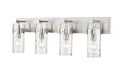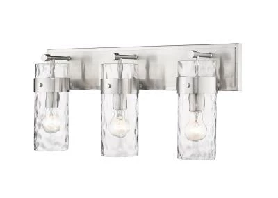 Equal parts stylish and functional, this three-light vanity fixture is alluring. The cylindrical glass shade is accented with a ripple texture in a romantic design. Steel construction in a brushed nickel finish allows it to pair with many types of decor ranging from farmhouse to modern.