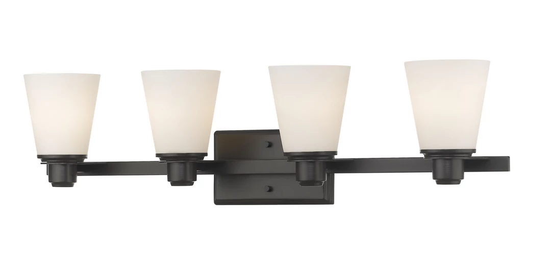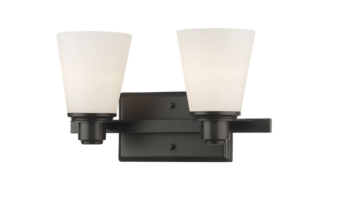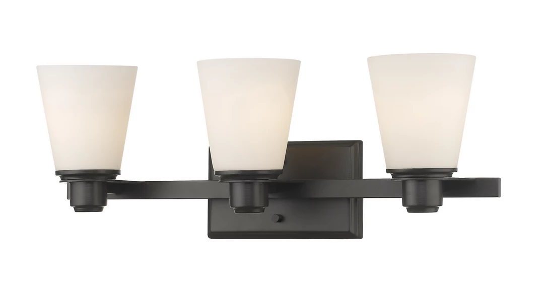 The Kyler collection features contemporary lines which are contrasted with Matte Opal shades atop Chrome, Brushed Nickel and Bronze fixtures.
