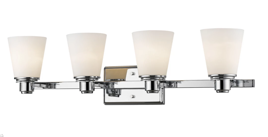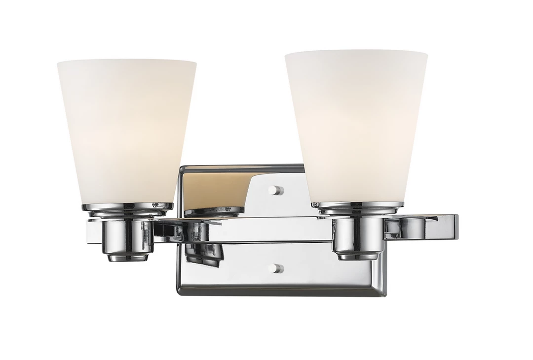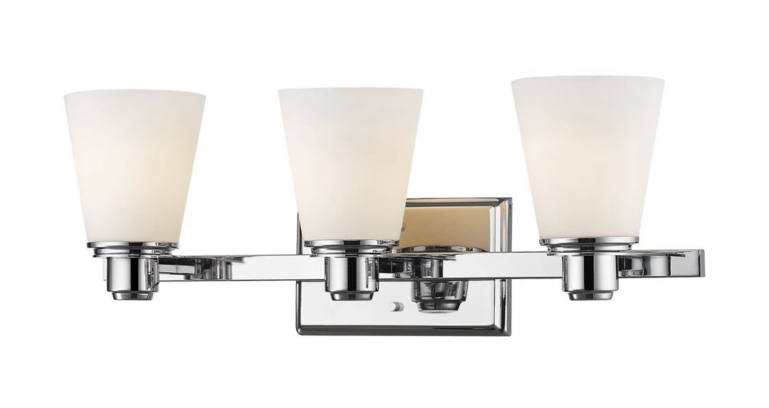 The Kyler collection features contemporary lines which are contrasted with Matte Opal shades atop Chrome, Brushed Nickel and Bronze fixtures.
