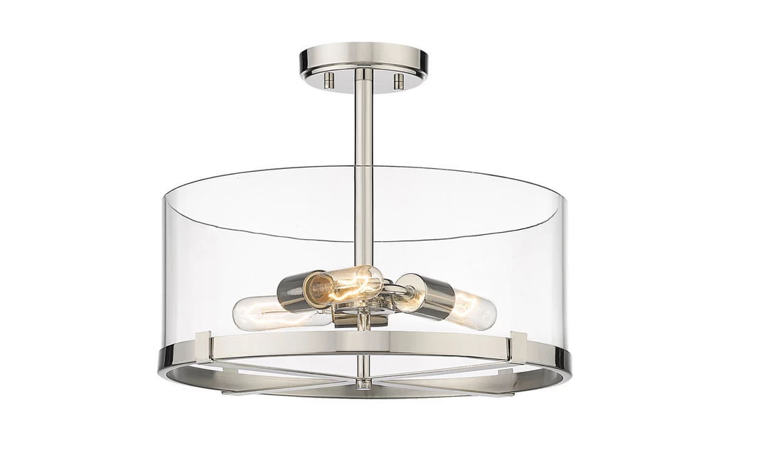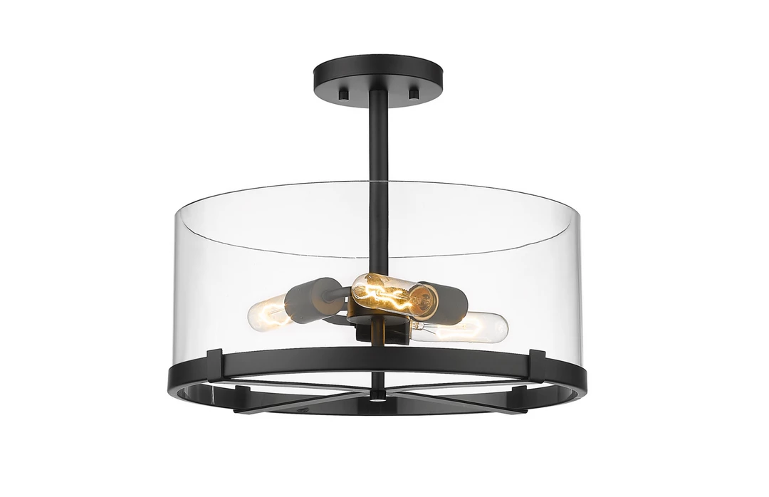 Brighten up your living environment with this classically crafted, metal and glass flush mount ceiling light. Three lights shine beneath a clear glass shade as a rich, rubbed brass, matte black, or polished nickel frame adds warmth to the design.