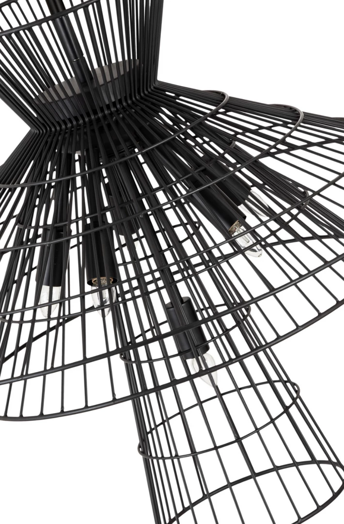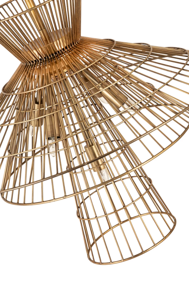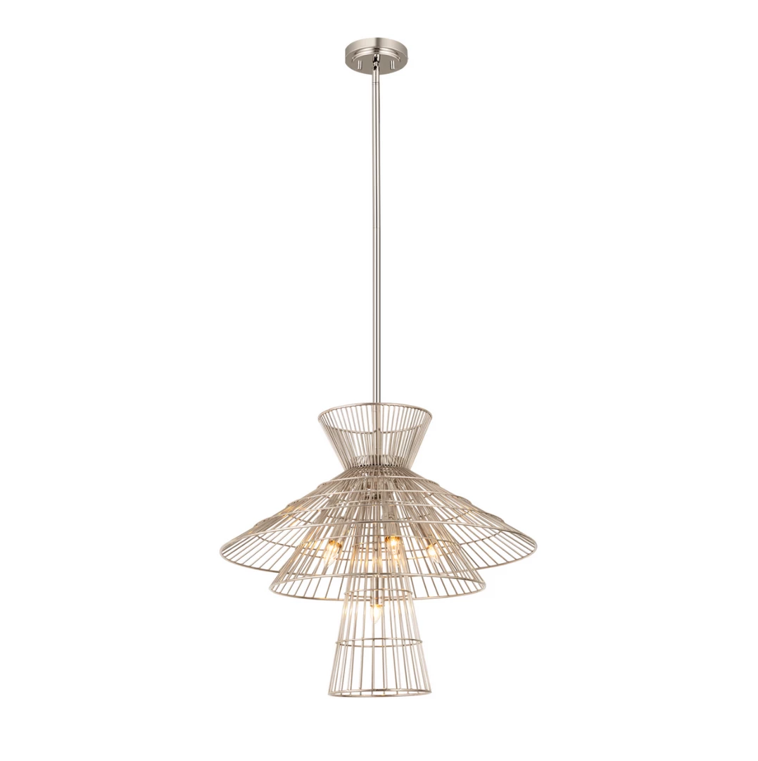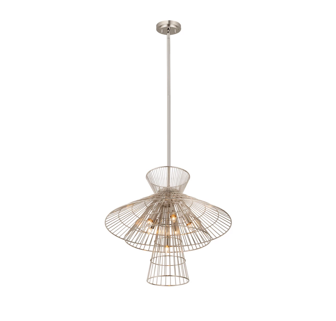 Offer up an energetic look while choosing lighting in a custom space, adding the Lolita six-light pendant to steal the show. Bold matte black, brass, or polished nickel finish iron crafts a tiered geometric arrangement of wired pieces and matching down rod and canopy. This striking fixture reflects a blend of industrial and modern styling.