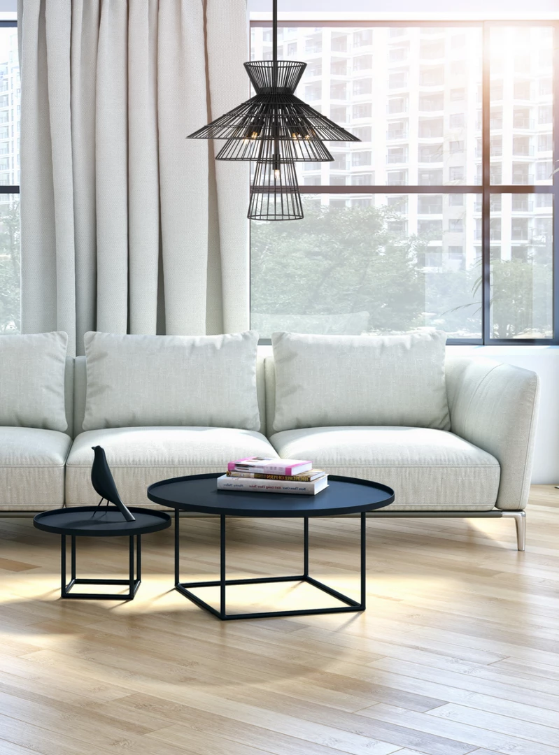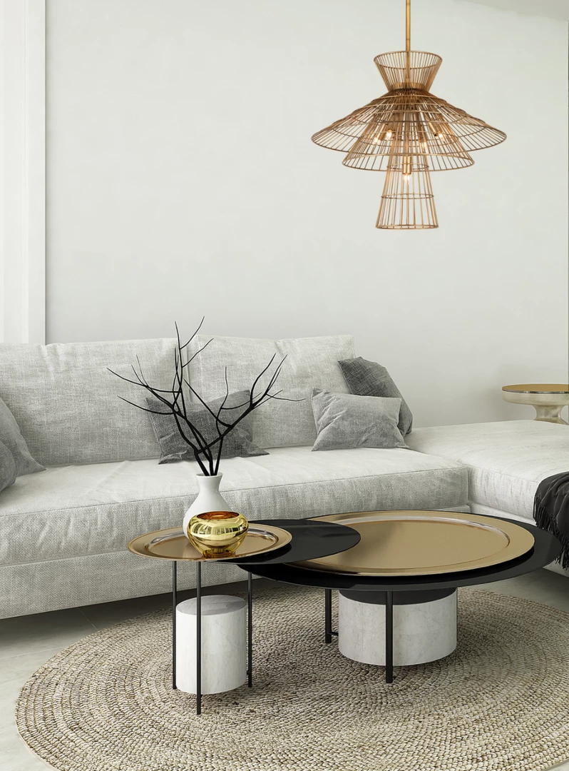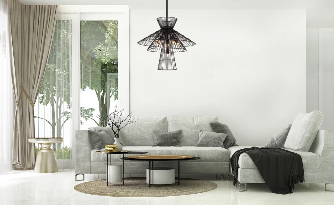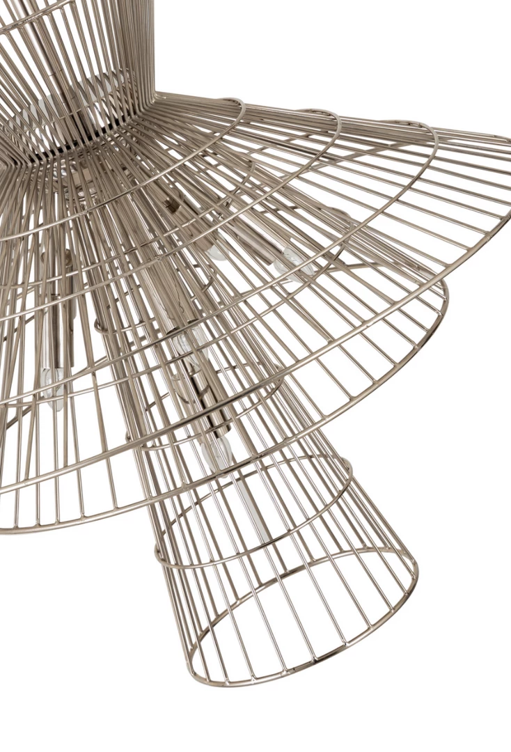 Offer up an energetic look while choosing lighting in a custom space, adding the Lolita six-light pendant to steal the show. Bold matte black, brass, or polished nickel finish iron crafts a tiered geometric arrangement of wired pieces and matching down rod and canopy. This striking fixture reflects a blend of industrial and modern styling.