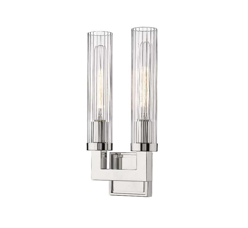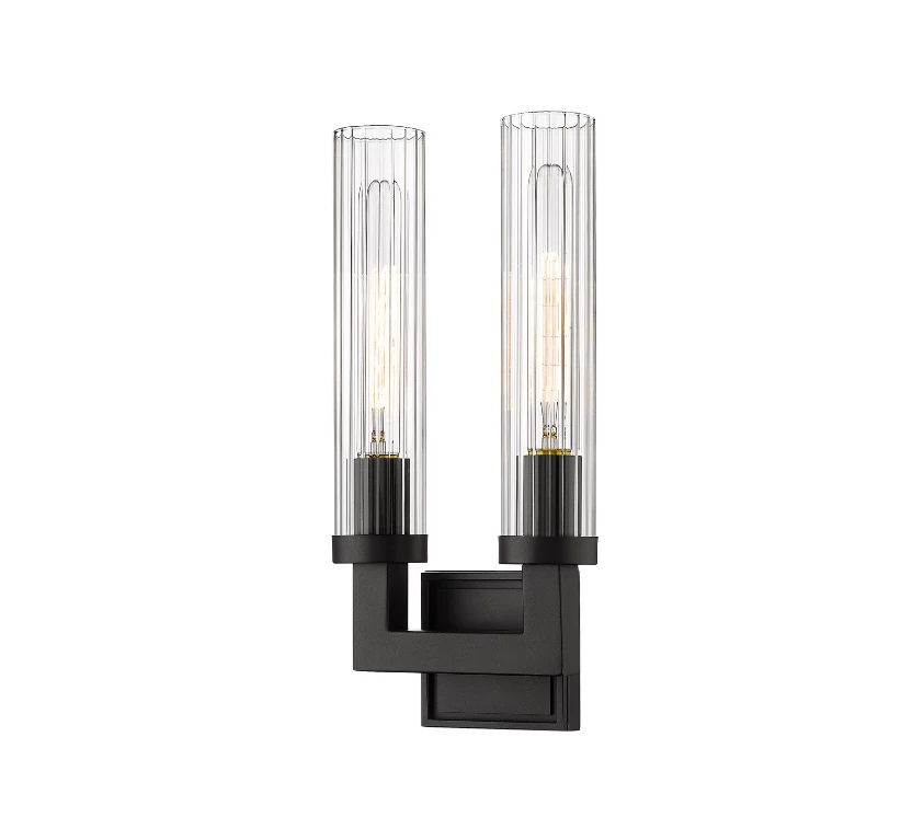 Add effortless sophistication to transitional or modern dуcor with this elegant, two-light wall sconce. With a strong steel frame in a rubbed brass finish and two elegant, textured glass shades, this fixture adds inviting ambiance to hallways, stairwells, and more.