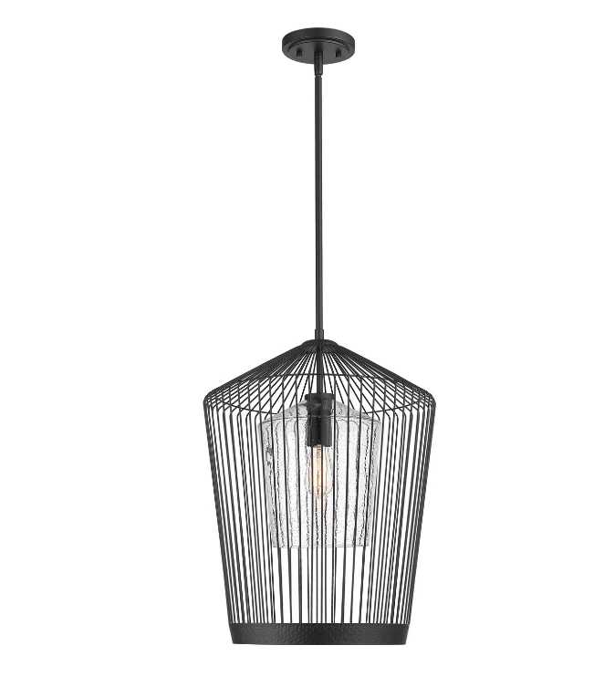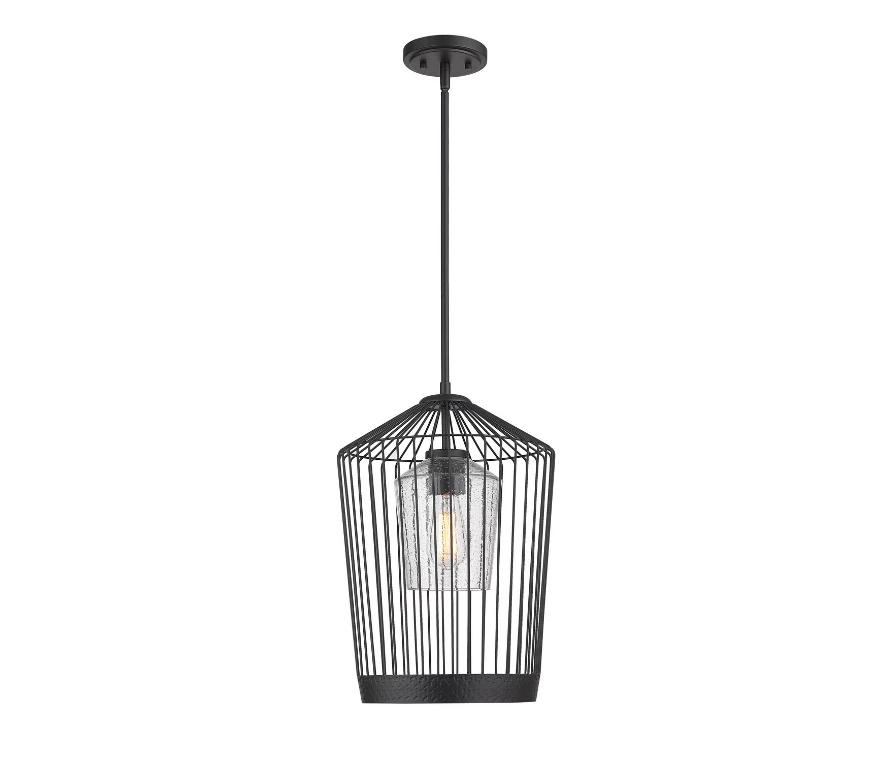 Bring an urban allure to your kitchen with a pendant light in matte black. This light provides a warm, modern glow behind the cylindrical clear seeded glass shade for an incredible ambiance.