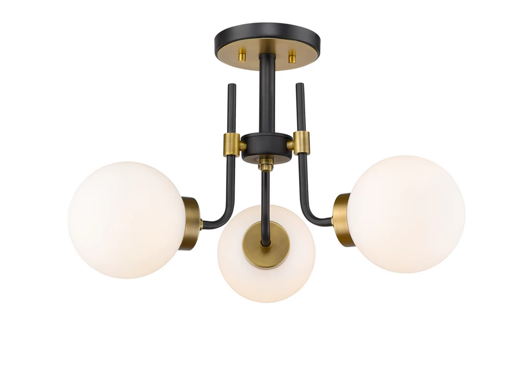 Enhance your home lighting options with the rich tones of this three-light semi-flush mount light. It’s fashioned with a matte black and olde brass finish and opal shades that deliver all the warm glow you want. It will add a touch of ambient brilliance to any space in the home, whether it be a bathroom, bedroom, hallway, kitchen or dining room
