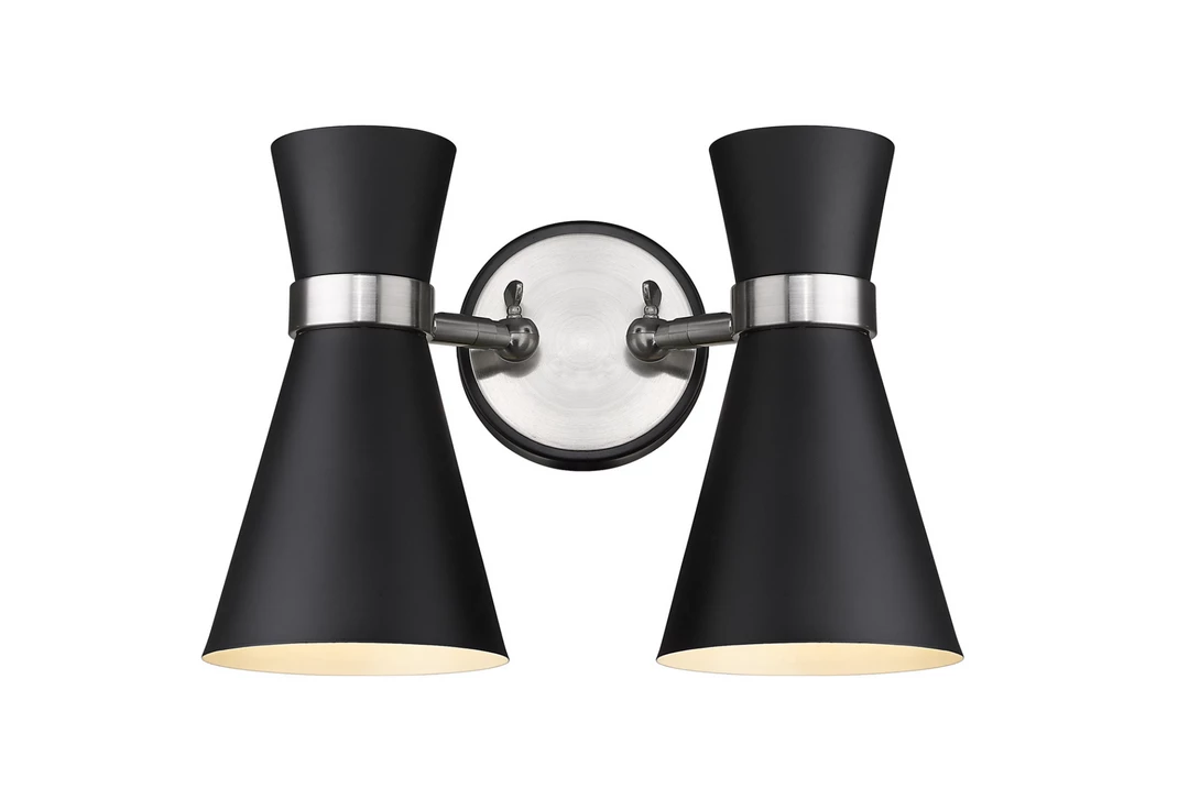 A decorative twin silhouette shapes industrial influence that adds casual elegance to this matte black finish steel two-light wall sconce. Dress up a bathroom or hallway with this tasteful fixture trimmed with heritage brass or brushed nickel finish steel. This dual sconce works perfectly as a bath light over a compact vanity.