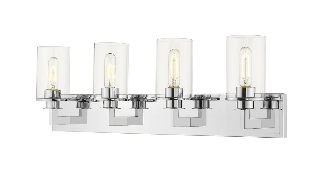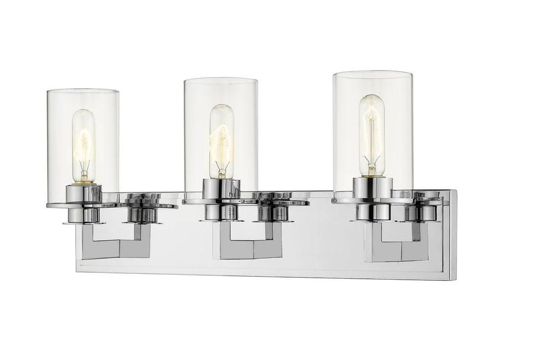Audaciously stylish with slim angled lines, this mid-century modern three-light vanity is the epitome of elegance. A shiny chrome finish underscores the stunning brightness of the clear glass cylinder-shaped shades.
