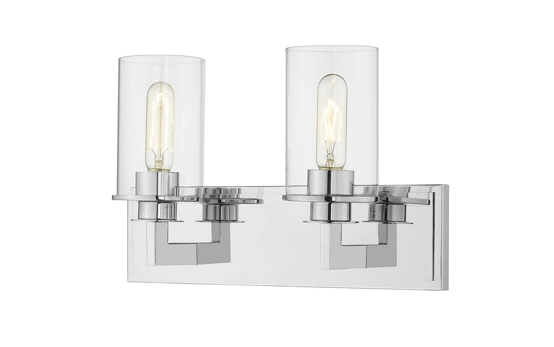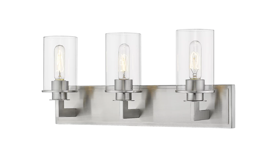 Industrially chic with a shine of nickel give this mid-century modern three-light vanity a modern charm. Emphasizing a glowing sense of agelessness, the nickel finish frames the clear glass cylinder shades.